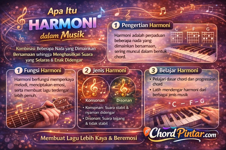 Harmoni dalam musik adalah kombinasi beberapa nada yang dimainkan secara bersamaan sehingga menghasilkan suara yang selaras dan enak didengar. Harmoni menjadi salah satu unsur penting dalam musik karena membantu memperkaya melodi dan menciptakan suasana tertentu dalam sebuah lagu. Dengan memahami konsep harmoni, musisi dapat menyusun chord, aransemen, serta struktur lagu dengan lebih baik. Artikel ini membahas pengertian harmoni dalam musik, fungsi harmoni, serta bagaimana cara memahaminya bagi pemula.