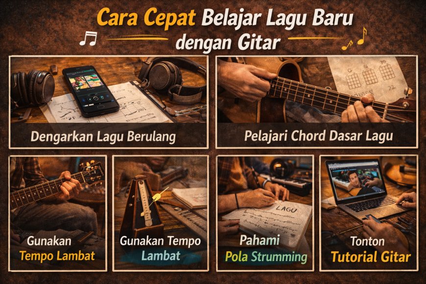 Panduan lengkap untuk membantu pemain gitar mempelajari lagu baru dengan lebih cepat dan efisien. Artikel ini membahas berbagai teknik seperti memahami chord dasar, mendengarkan lagu secara aktif, menggunakan tempo lambat, hingga berlatih secara konsisten agar proses belajar gitar menjadi lebih mudah.