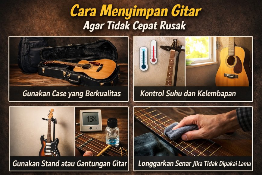 Cara menyimpan gitar dengan benar sangat penting untuk menjaga kualitas suara dan ketahanan alat musik. Dengan menggunakan hardcase atau gigbag, menjaga kelembaban ruangan, menghindari sinar matahari langsung, serta membersihkan gitar secara rutin, gitar dapat tetap awet dan menghasilkan suara yang optimal dalam jangka panjang.