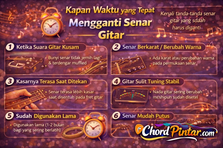 Beberapa tanda bahwa senar gitar perlu diganti antara lain suara yang mulai kusam, senar berkarat, terasa kasar saat dimainkan, serta sulit menjaga tuning.