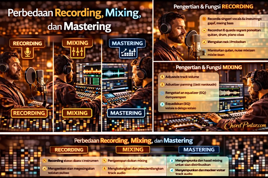 Recording, mixing, dan mastering merupakan tiga tahap penting dalam produksi musik yang saling melengkapi. Recording berfungsi untuk merekam suara, mixing digunakan untuk menggabungkan dan menyeimbangkan semua track, sedangkan mastering bertugas menyempurnakan hasil akhir lagu.