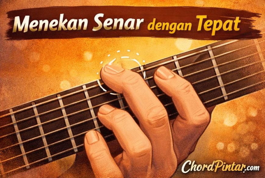 Menekan senar dengan benar adalah kunci untuk menghasilkan suara yang jernih. Tekan senar menggunakan ujung jari dan posisikan jari sedekat mungkin dengan fret tanpa menyentuh garis fret.